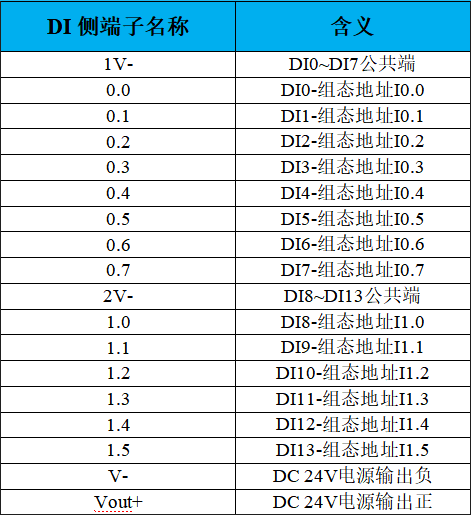 GCAN-PLC-324E/R系列的主控模塊DI端子排接線方式如圖,DI0~DI7的輸入公共端均接入1V-,DI8~DI13的輸入公共端均接入2V-,圖中接線示意均以DI為PNP數(shù)字量輸入為例。